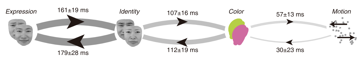 除了让参与者在性别和表情的规则间切换,研究人员还测试了其它的感知特征(图3)。研究表明切换成本的大小与感知特征之间的重叠程度相关,在更为独立的感知特征之间切换时(例如运动与颜色)切换成本较小,而在更相似的感知特征之间切换时(例如面孔的性别与表情)切换成本较大。这些结果表明任务切换的限制源于感知系统与决策系统之间的相互作用,而非仅仅是抽象认知状态转变的结果。