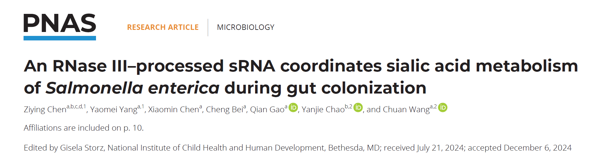 1月11日,中国科学院上海免疫与感染研究所晁彦杰研究员团队在《美国科学院院刊》(PNAS)上发表了题为 “An RNase III-processed sRNA coordinates sialic acid metabolism of Salmonella enterica during gut colonization” 的研究论文,揭示了肠道沙门氏菌如何通过非编码小RNA在转录后水平协调N-乙酰神经氨酸代谢过程中不同氨基糖操纵子转录产物的机制。