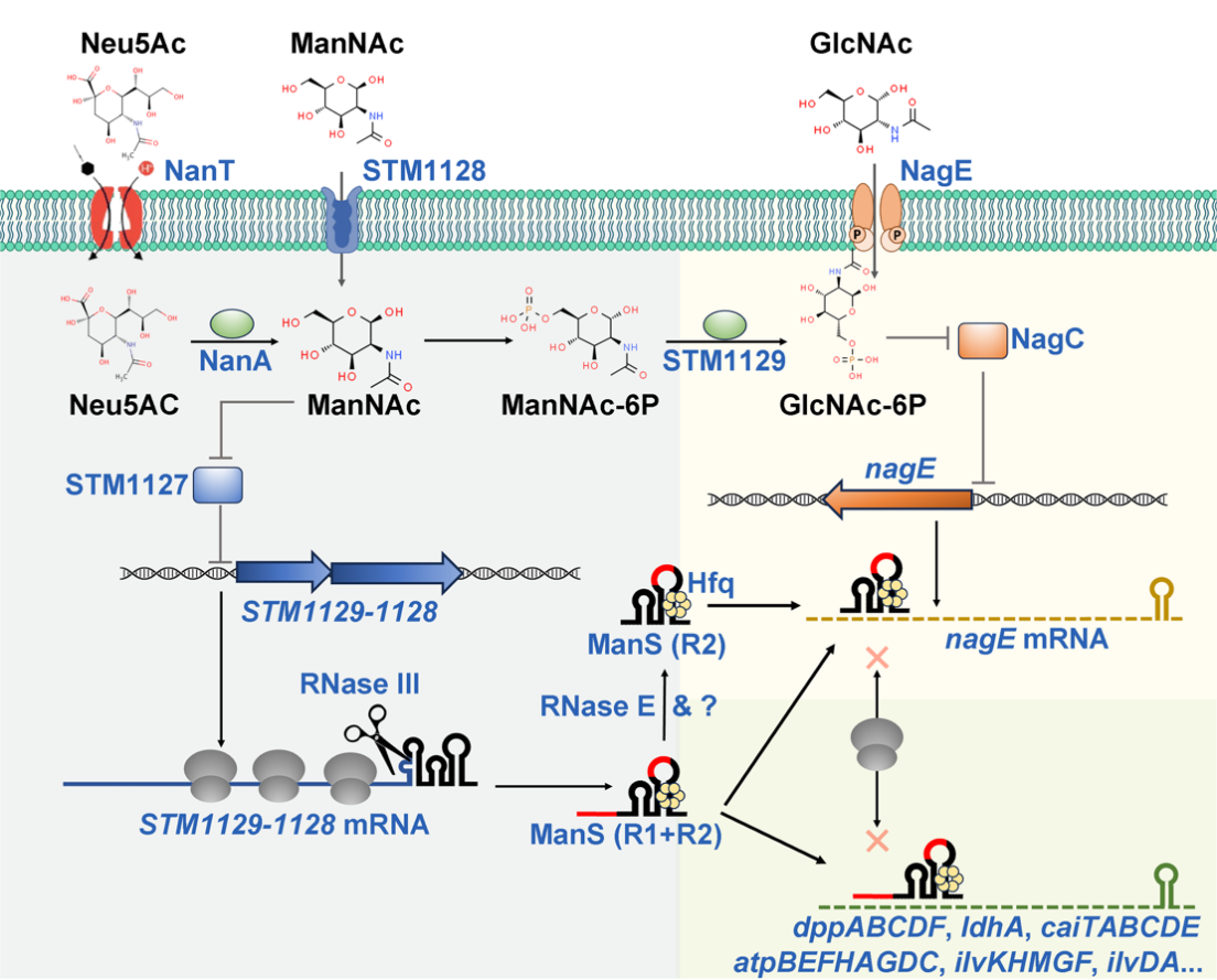 图:肠道沙门氏菌非编码小RNA ManS协同N-乙酰神经氨酸代谢过程中不同氨基糖代谢通路的示意图。来源于环境中或N-乙酰神经氨酸代谢产生的N-乙酰甘露糖胺激活肠道沙门氏菌特异基因岛STM1127-STM1131的表达。核酸酶RNase III通过识别来自于该基因岛的转录本STM1129-STM128 mRNA末端的双链区域的“泡”状结构进行不完全切割,产生ManS的前体并进一步被其它核酸酶加工成不同大小。ManS通过两个调控区域(红色标记)来对N-乙酰葡萄糖胺等代谢通路进行选择性调控。
