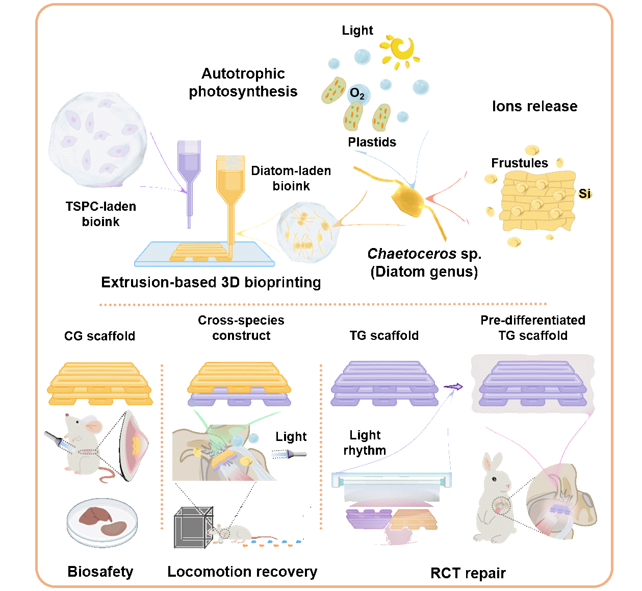 近日,中国科学院上海硅酸盐研究所吴成铁研究员带领研究团队在3D生物打印跨物种细胞共生支架用于肌腱-骨重建领域取得新进展。受到海洋藻类为各类生物和周围环境提供充足氧气及营养物质的启发,该研究团队提出通过跨物种共生实现海洋硅藻活体驯化哺乳动物细胞的理念。硅藻是一种特殊的近海藻类,具有功能性的硅质细胞壁和自发荧光的光合色素,能够持续释放活性硅离子,并通过光合作用产生氧气,为调节微环境、改善组织再生中细胞功能障碍提供了新思路。基于此,研究团队将硅藻与哺乳动物组织细胞结合,采用3D生物打印技术,设计了一种硅藻活体衍生的跨物种构建体,改善肌腱细胞微环境,促进肌腱-骨界面损伤修复(图1)。该研究成果以“Diatomaceous Cross-Species Constructs for Tendon-to-Bone Regeneration”为题,近日发表于国际知名期刊Materials Today(https://doi.org/10.1016/j.mattod.2024.12.010),并申请发明专利一项。论文第一作者为上海硅酸盐所博士生韩雅卉,通讯作者为吴成铁研究员。