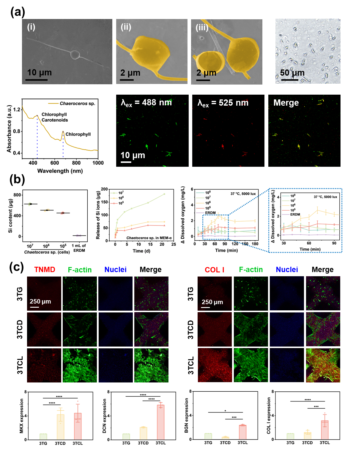 图2. 角毛藻的表征和跨物种支架的成腱分化。(a)角毛藻的SEM图像、伪彩图像、明场图像、UV-vis光谱和自发荧光;(b)硅质壳中硅含量测量、硅离子释放和光合作用产生溶解氧含量;(c)跨物种支架的体外生物活性。