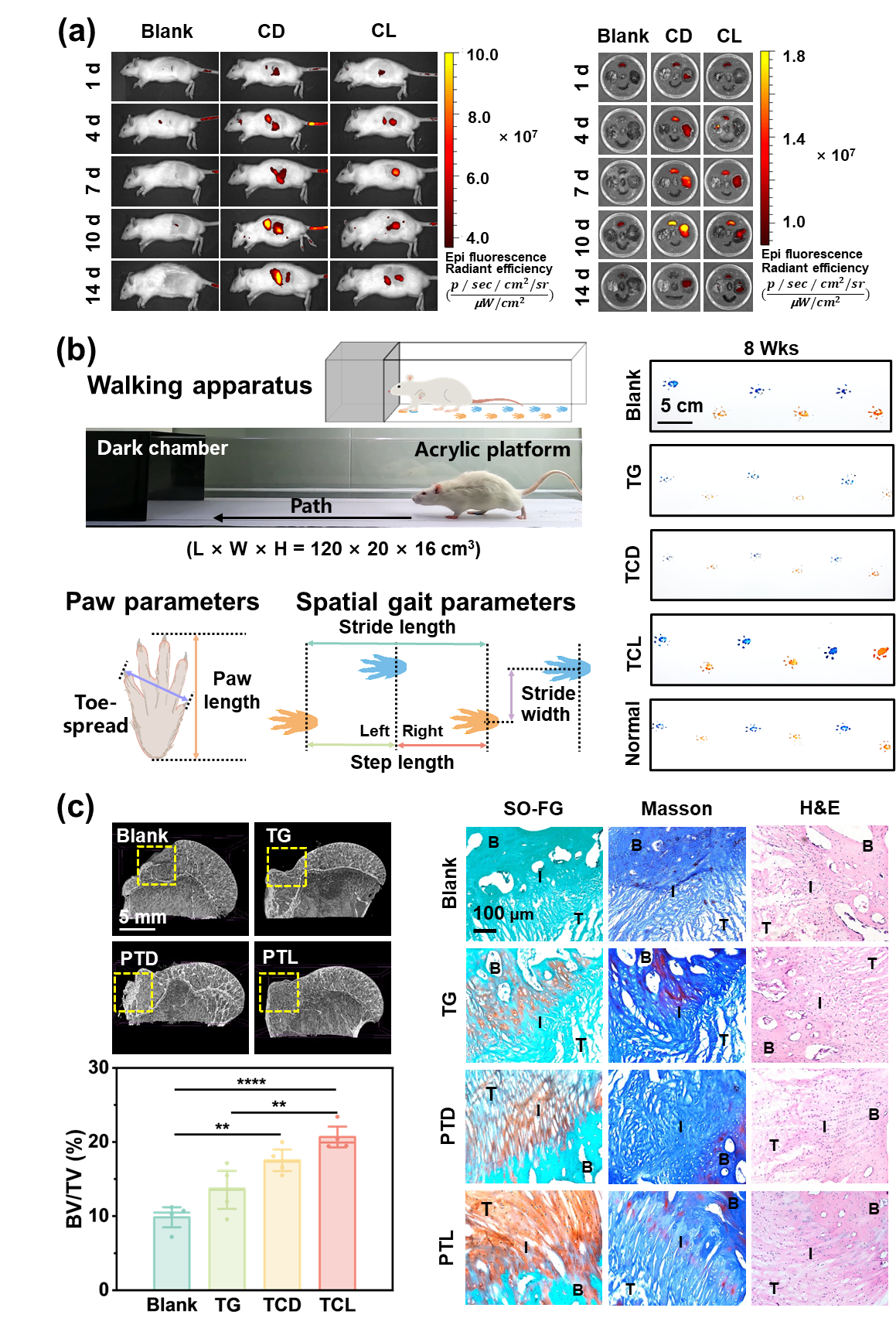 研究团队通过3D生物打印构建跨物种共生支架,其中,角毛藻(硅藻纲)和肌腱干/祖细胞以分层方式分布于甲基丙烯酰化明胶生物墨水中。跨物种支架具有独特的优势,自发荧光便于观察,自主光合可持续供氧,硅藻可降解的硅质细胞壁利于硅离子释放,通过MAPK/cAMP/昼夜节律信号通路激发肌腱干/祖细胞的成肌腱分化,为促进肌腱-骨界面组织再生提供条件(图2)。硅藻活体对大鼠皮下模型无急性不良反应和毒、副作用(图3a)。在大鼠肩袖撕裂模型中,跨物种支架在节律光照下,能够缓解损伤部位乏氧,促进大鼠运动功能恢复(图3b)。在兔肩袖撕裂模型中,由硅藻支架预培养分化后的肌腱支架展示出良好的肌腱-骨界面修复效果(图3c)。这种可时空控制的跨物种构建体得益于海洋硅藻固有的光合作用和硅离子释放,有望用于人体工程化组织修复与再生。