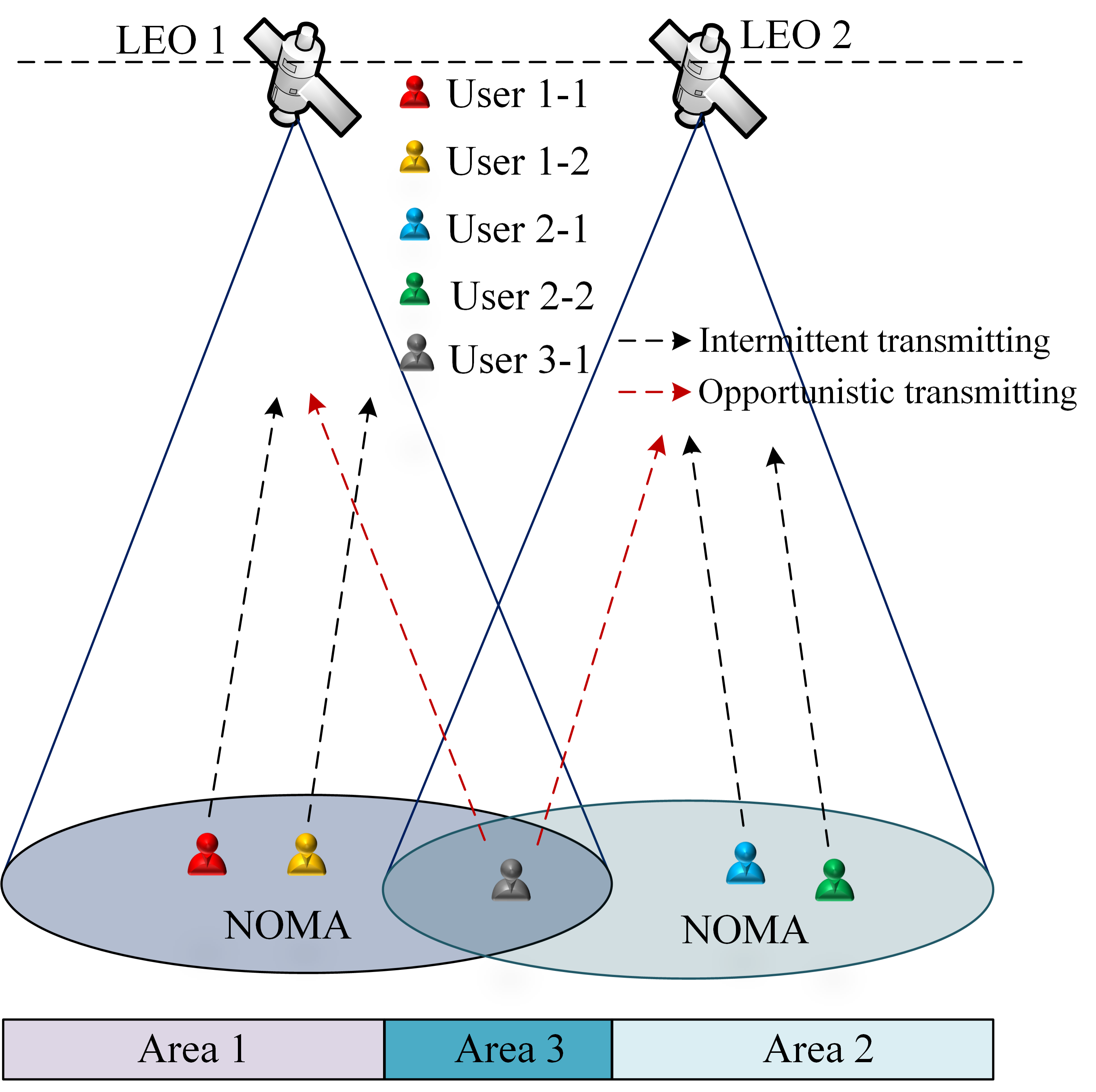 图1.不同低轨卫星覆盖下,地面上行用户传输场景的频谱感知模型