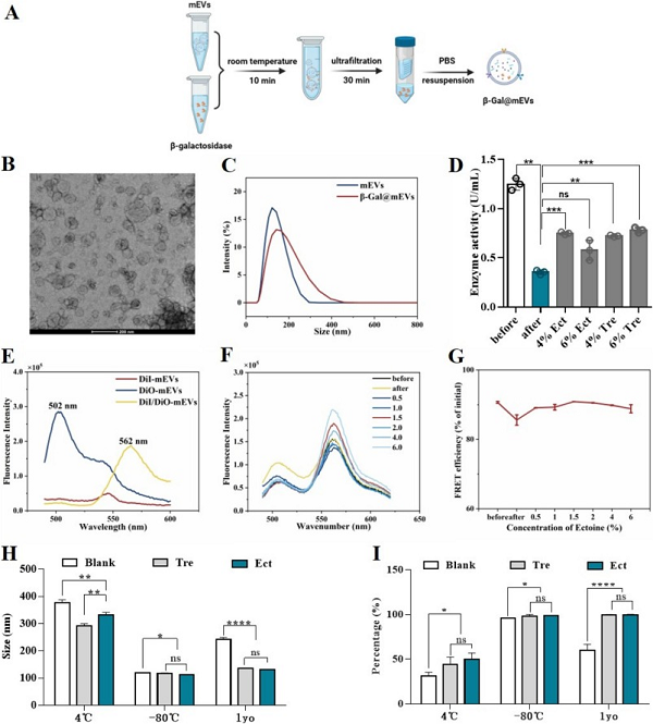 本研究通过测定β-半乳糖苷酶(β-Gal)活性评估mEVs稳定性(图1 A-C),结果显示冻干处理后,依克多因组显著提高了β-Gal酶活性的保留。荧光共振能量转移(FRET)分析显示(图1 E-G),1.5%依克多因能维持DiO/DiI共标记mEVs的稳定能量转移效率。长期稳定性实验结果(图1 H,I)显示,不做任何处理的mEVs在4℃储存60天后,粒径明显增大,且颗粒数减少,而冻干mEVs在同样条件储存后粒径和颗粒数变化最小。在体外细胞实验中,冻干mEVs能有效保护人角膜上皮细胞免受高渗条件损伤。因此,依克多因能维持mEVs冻干后的结构稳定性,是一种极具潜力的冷冻保护剂。