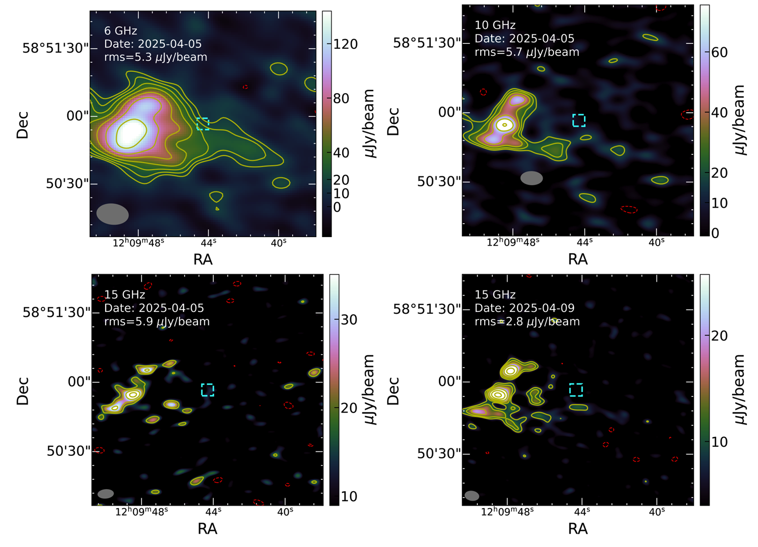图:甚大阵射电望远镜(VLA)图像显示,在不同频段和观测时段均未在FRB 20250316A位置检测到持续射电源。