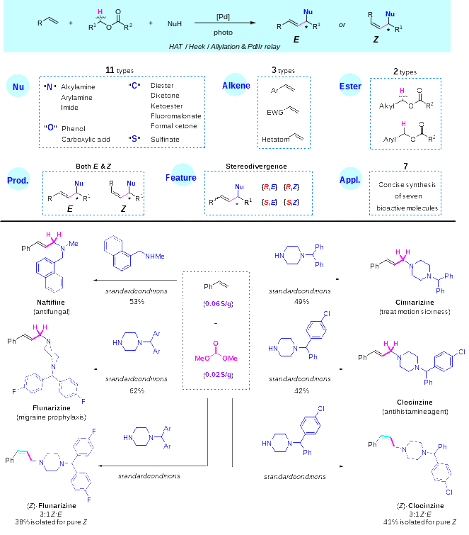 传统的烯丙基取代反应需预制含邻位杂原子离去基的烯丙基单元。近年来,从简单底物出发,实现烯丙基化合物的高效构建引起了广泛关注。近日,何智涛课题组在Angew. Chem. Int. Ed.上在线发表了题为 “Stereodivergent Assembling Tsuji–Trost Reaction via Photoinduced Pd and Pd/Ir Relay Catalysis”的研究论文。该工作报道了一种光致钯催化的原位组装烯丙基取代反应,可直接从廉价易得的烯烃、酯以及亲核试剂作为原料,一步组装合成烯丙基化合物。该过程具有极为广泛的底物普适性,可兼容碳、氮、氧、硫亲核试剂,还能实现不对称催化转化历程。通过调整手性控制条件以及Z/E选择性控制条件,可以实现目标烯丙基化合物的立体发散性合成,获得精准调控“中心手性+烯烃几何构型”的四种异构体(图1)。机理研究证明了该反应经历激发态钯启动的HAT/Heck/Tsuji-Trost串联过程。此外,该转化可以从基础的原料出发,方便地制备得到一系生物活性分子,展现出该合成策略的高应用潜力。