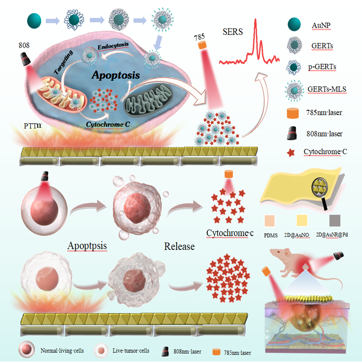 为了实现单个凋亡细胞释放细胞色素C空间分布的原位监测,张云课题组发展了一种双功能3D SERS基底,在单细胞水平实现了细胞凋亡释放细胞色素C的定量成像分析,并实现了活体光热治疗肿瘤过程中肿瘤组织内细胞色素C的原位监测 (图2)。该3D基底通过上下两层纳米结构之间的表面等离激元耦合作用,协同形成兼具光热和SERS检测的双功能特性。通过在3D 基底表面原位培养细胞,在光热效应诱导细胞凋亡后,我们获得了单个细胞释放细胞色素C的原位定量SERS成像。通过该技术,我们进一步研究了不同细胞系对凋亡时细胞色素C释放的影响。通过构建双功能3D SERS基底的可穿戴贴片,实现了小鼠肿瘤光热治疗过程中,凋亡肿瘤细胞释放细胞色素C的原位监测。我们所开发的方法为深刻理解细胞凋亡释放代谢物如何影响周围细胞生理过程提供了技术支持。
