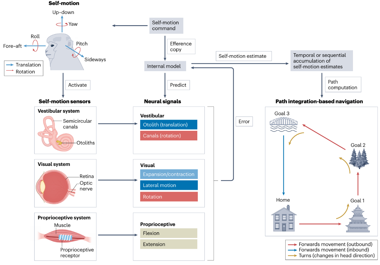图一:自身运动感知涉及到主动运动指令预测和多感官系统反馈,可以用内部模型(internal model)来描述(左图);即时的自身运动信号可以通过时间上的整合进行路径计算(path computation),从而允许在缺乏外界路标的场景下实现向量导航(vector navigation,右图)。