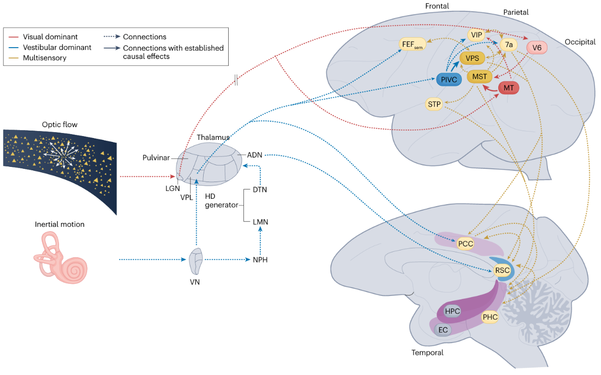 图二:内耳前庭和视觉光流自身运动信息(左图)在灵长类大脑新皮层多脑区汇聚(右上图),并投射到海马-内嗅皮层的导航系统(右下图)。