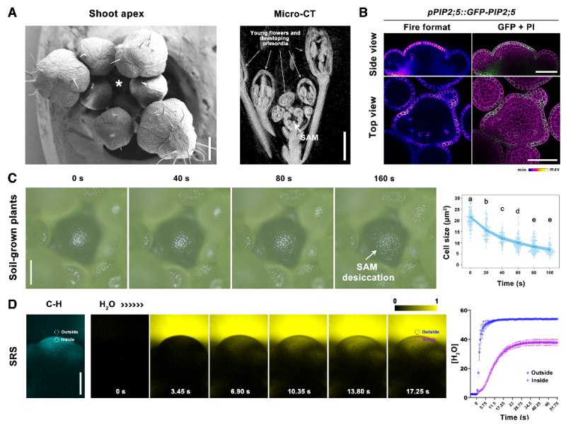 茎尖分生组织主要由干细胞组成,是植物地上部分所有器官的来源,其活性维持对作物产量和品质至关重要。位于分生组织最外层的表皮层(L1层)不仅是干细胞的物理屏障,更是感知外界环境信号的关键界面。本研究发现,植物茎尖分生组织处于局部高湿微环境中,能够主动感知湿度变化以维持其分裂能力。当水分平衡被破坏时,干细胞活性受到显著抑制,导致器官发育受阻,进而影响整体植株生长。为深入解析水分动态过程,研究团队与复旦大学季敏标课题组合作,首次将受激拉曼显微技术(SRS)应用于植物研究,实现了在细胞水平对植物组织中水分交换过程的无损实时动态监测。