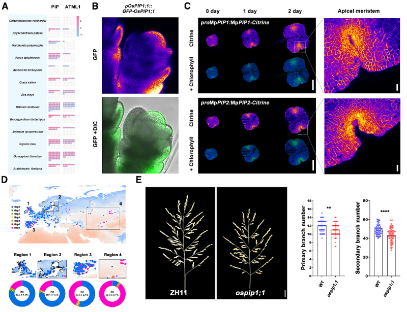 值得注意的是,表皮介导的分生组织水分感知与响应机制在植物演化中高度保守。研究团队在早期陆生植物地钱(Marchantia polymorpha)和单子叶作物水稻(Oryza sativa)中均发现了类似的表皮特异性水分通路。水稻同源基因OsPIP1;1不仅功能与拟南芥PIP2;5相似,其单倍型分布也与空气湿度密切相关:高表达单倍型OsPIP1;1-SNPT多见于湿润地区,而低表达单倍型OsPIP1;1-SNPC则偏好干旱环境,表明OsPIP1;1介导的水稻穗原基水分感知,同样受到气候驱动的自然选择。这些发现为解析植物适应陆生环境的演化机制提供了新线索,也为挖掘植物可塑性潜力、培育环境适应性作物新品种提供了理论依据。