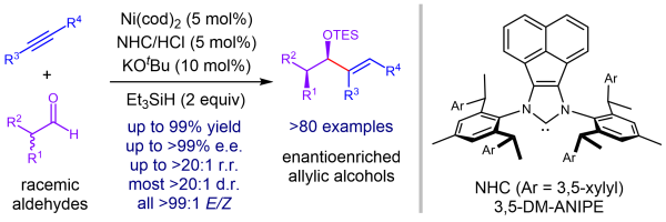 在此研究中,手性NHC/镍催化剂能够同时控制反应的化学、对映、非对映、区域以及顺反选择性,实现消旋醛到复杂烯丙醇产物的精准转化。该反应具有优秀的官能团兼容性以及广阔的底物范围,适用于α-芳基、胺基、烷氧基甚至全烷基取代的醛类底物,以及多种对称和非对称炔烃底物。该方法还可以应用于布洛芬类药物分子的快速改造以及生物活性分子鞘氨醇的形式合成。机理研究表明底物消旋化速率对反应立体选择性存在重要影响。该研究工作扩展了动态动力学拆分化学的应用范围,简化了复杂手性醇分子的合成。