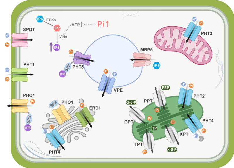 磷是植物生长发育所必需的大量营养元素。然而,土壤中无机磷(Pi)含量通常较低,限制了农作物产量,是全球农业生产面临的重要挑战。植物依靠多种Pi转运蛋白协同完成磷的吸收、转运与分配:位于根部的PHT1家族蛋白介导土壤中Pi的吸收,PHO1负责将Pi从根向地上部分的转运,SPDT则调控Pi在节部组织中的分配,并进一步影响Pi向籽粒的转运,VPE蛋白与PHT2/3/4/5蛋白则参与亚细胞水平的Pi稳态调控(图1)。