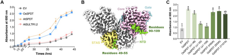 本研究中,研究人员聚焦水稻(Oryza sativa)中位于节间参与籽粒Pi分配的关键蛋白OsSPDT(即SULTR3;4)开展研究。OsSPDT属于硫酸盐转运蛋白SULTR家族,却特异性地转运磷酸盐。SPDT如何实现从硫酸盐向磷酸盐转运的功能演化,其分子机制一直未被揭示。