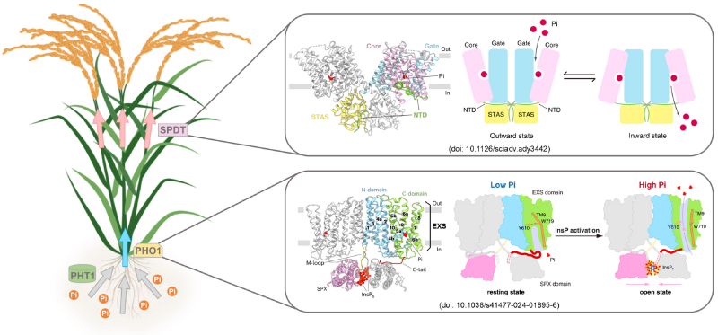 至此,植物中两类不同家族的无机磷转运蛋白PHO1;H1(SPX-EXS家族)和SPDT(SULTR家族)的三维结构组成、底物识别/转运与调控机制得到了深入解析。鉴于两类蛋白在磷的长距离运输(PHO1)与组织分配(SPDT)层面所起的关键作用,本研究在揭示植物磷稳态调控分子机制的同时,也为培育低植酸、高磷利用效率的作物品种奠定了基础(图3)。