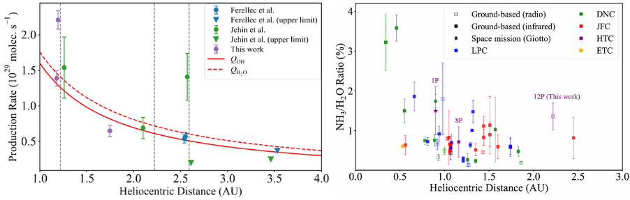 图2:(左)12P的OH和水产率随日心距的变化关系;(右)不同彗星的NH3丰度随日心距的关系