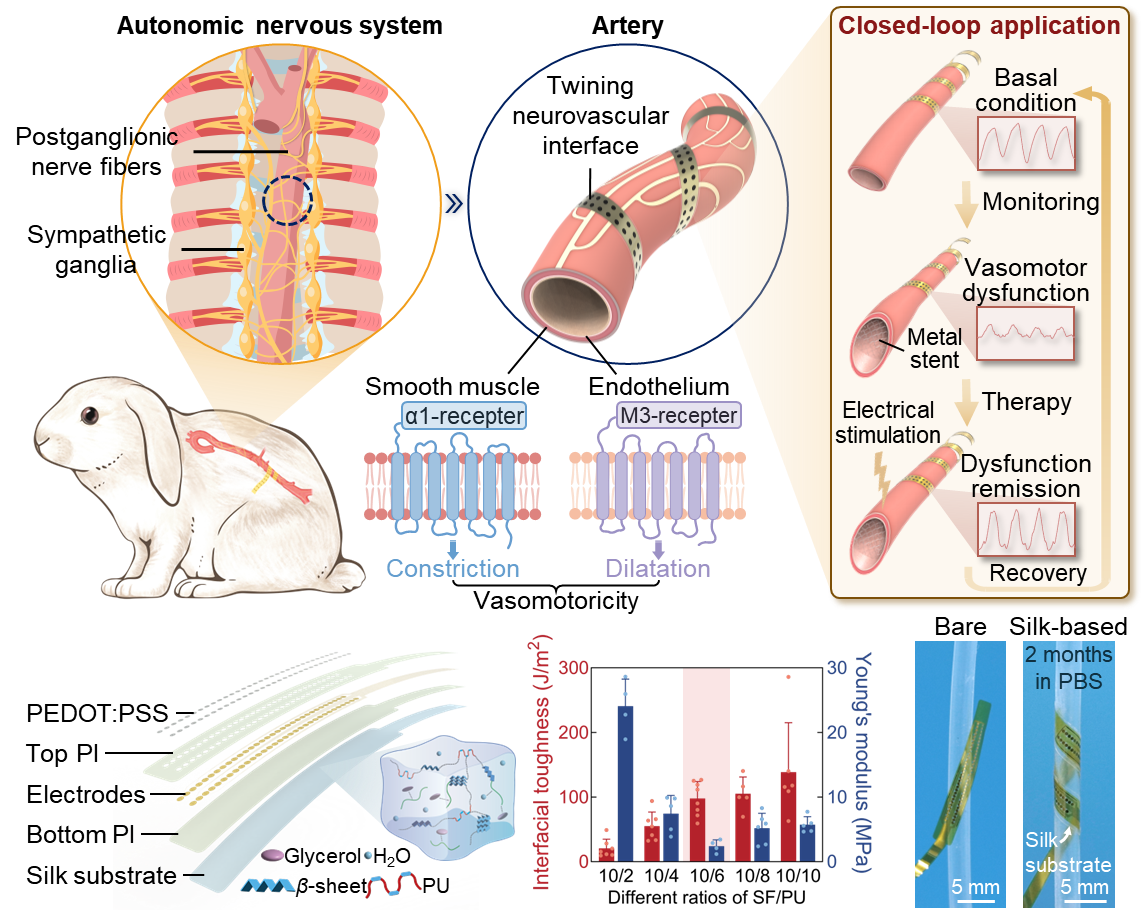 研究团队结合半导体微纳制造工艺与丝素蛋白材料功能化方法,研制出基于可粘附丝素蛋白的生物可粘附、曲面可贴服柔性血管神经接口,可在复杂液体环境中与血管三维曲面紧密共形贴附。柔性神经接口与血管周向分布的交感神经网络形成稳定耦合,从而实现了高保真、高质量的血管电生理信号采集,并能够精准分辨不同舒缩状态下的交感神经活动模式。