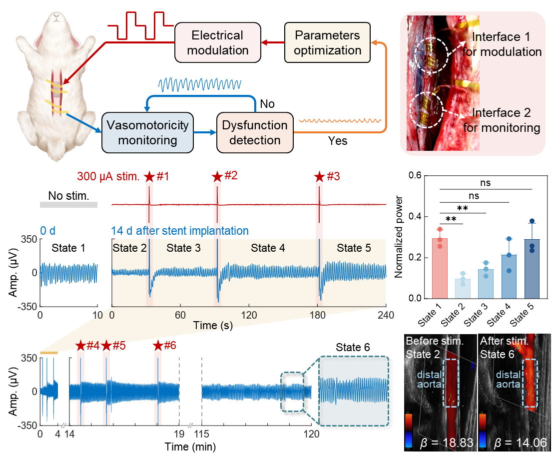 进一步地,针对金属支架植入诱发的血管失功问题,该接口不仅能够实时监测血管舒缩功能的动态变化,还能够对异常舒缩血管给予电刺激以恢复其正常调节能力,并以基于临床金标准血管超声的动脉硬度参数验证了其在功能干预中的有效性,从而为血管失功提供了一种全新的诊疗范式。