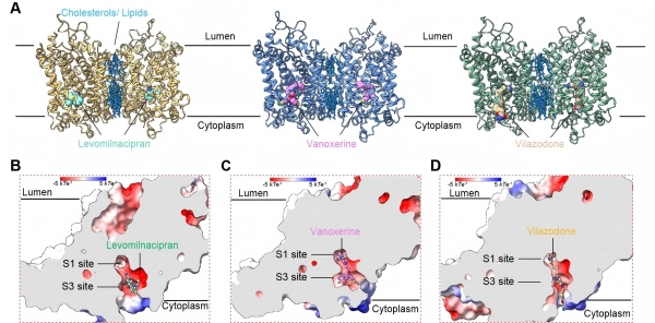 研究团队解析了人源NET分别与抗抑郁药物左米那普仑、维拉佐酮,以及NET与多巴胺转运体双重再摄取抑制剂伐诺司林结合的三个冷冻电镜结构,分辨率达2.44–2.52 Å(图1A)。研究显示,三种复合物中NET均呈现内向开放构象。左米那普仑结合于一个NET内向开放构象特异的新型变构位点(图1B)。该位点被命名为S3,以区别于中央正构位点S1和位于靠近胞外区的外向开放构象变构位点S2。与之不同,维拉佐酮和伐诺司林则同时占据S1与S3位点(图1C,D)。