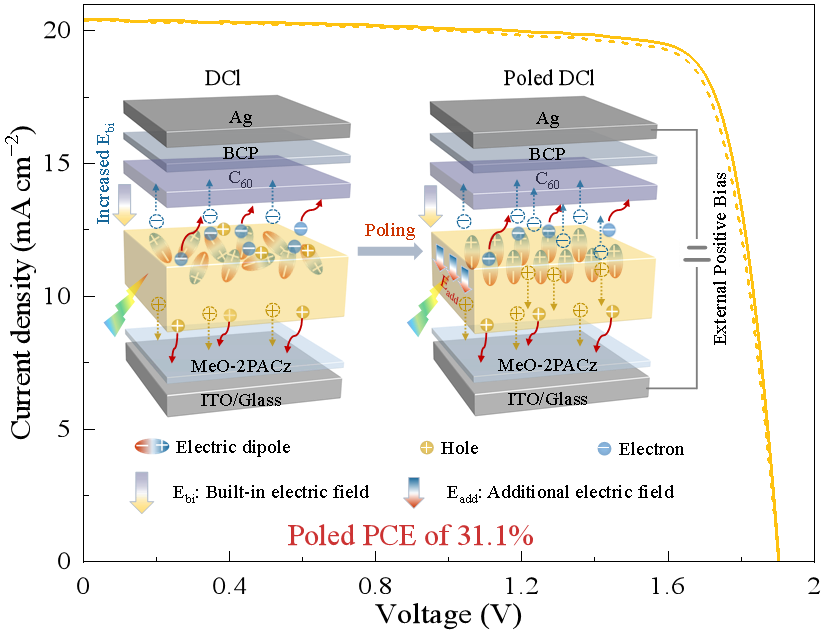 近期,中国科学院宁波材料技术与工程研究所光电信息材料与器件实验室高效太阳能电池及宽禁带半导体团队在叶继春研究员的带领下,在前期晶体硅和钙钛矿太阳电池研究的基础上(Nat. Energy 2025, 10, 737; Nat. Energy, 2023, 8; Joule 2022, 6, 2644; Nat. Commun. 2024, 15, 8453; Nat. Commun. 2023, 14, 2166; Adv. Mater. 2023, 35, e2211962; Adv. Energy Mater. 2024, 2403021; Adv. Funct. Mater. 2024, 34; Sci. Bull. 2024, 69, 1887; ACS Energy Lett. 2024, 9, 4018; Nano Energy 2022, 100, 107529; ACS Appl. Mater. Interfaces 2022, 14, 52223; Adv. Energy Mater. 2023, 13, 2203006; J. Mater. Chem. A, 2023,11, 6556; Adv. Funct. Mater. 2023, 2304708; Adv. Energy Mater. 2023, 13, 2203006.),在高效钙钛矿/硅叠层电池领域取得了新的进展。该团队设计合成了一种兼具路易斯酸碱官能团的高极性笼状二胺氯化物来减少钙钛矿薄膜缺陷和调控界面偶极,从而抑制非辐射复合和优化表面能级排列。同时,这种独特的笼状阳离子能诱导形成具有自发面内取向的纯相、准二维钙钛矿,并展现出显著的铁电效应,可进一步降低钙钛矿表面功函数以促进载流子分离与提取。基于此,0.1cm2和1.21cm2的1.68eV钙钛矿单结太阳能电池分别获得了22.6%和21.0%的PCE。此外,基于隧穿氧化物钝化接触的1.0cm2两端口钙钛矿/硅叠层太阳电池实现了31.1%的PCE,并表现出良好的工作稳定性(ISOS-L-1,T85>1020h)。铁电界面物理特性为高效稳定的钙钛矿基叠层光伏技术开辟了全新可能性。