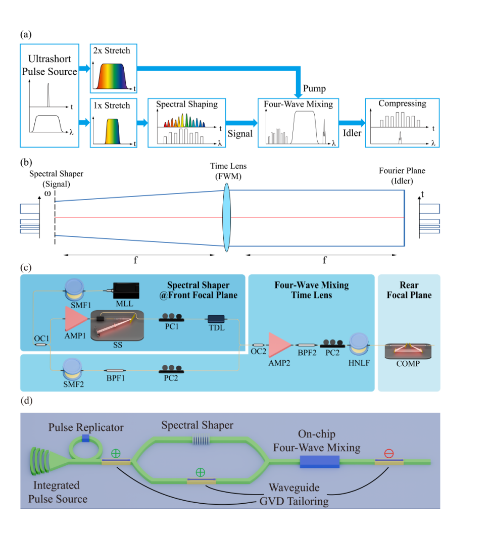 针对上述挑战,研究团队创新性地提出一种基于光波导四波混频的脉冲时域任意整形技术 (Four-wave Optical-waveguided Chirp-free Ultrafast Shaping,FOCUS),并成功实现了时域分辨率2ps、记录长度400ps、中心波长可调谐范围3.5nm的消啁啾脉冲序列输出。该技术为STUD等方案所需的激光脉冲产生提供了可行的技术路径,同时具备向集成化光任意波形发生芯片发展的潜力。