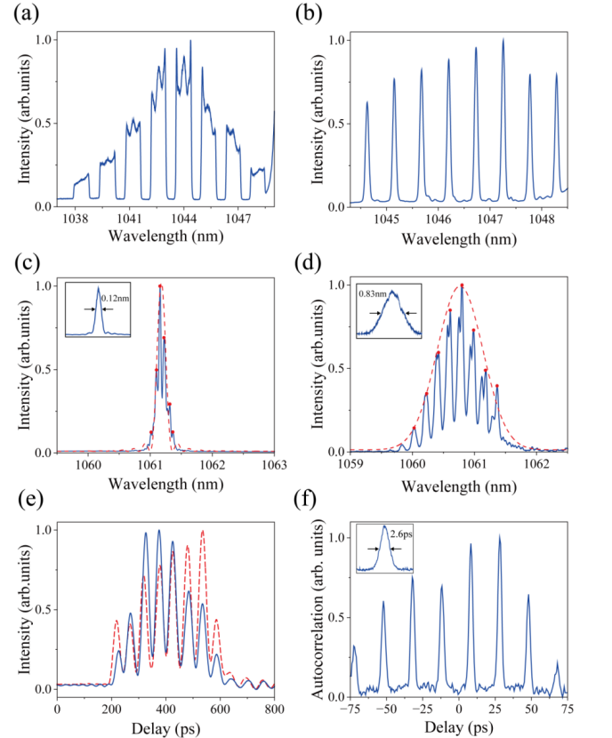 图 2. (a)和(b)光谱整形图;(c)和(d)基于四波混频的光谱转录结果图;(e)和(f)消啁啾的高分辨率激光脉冲序列。