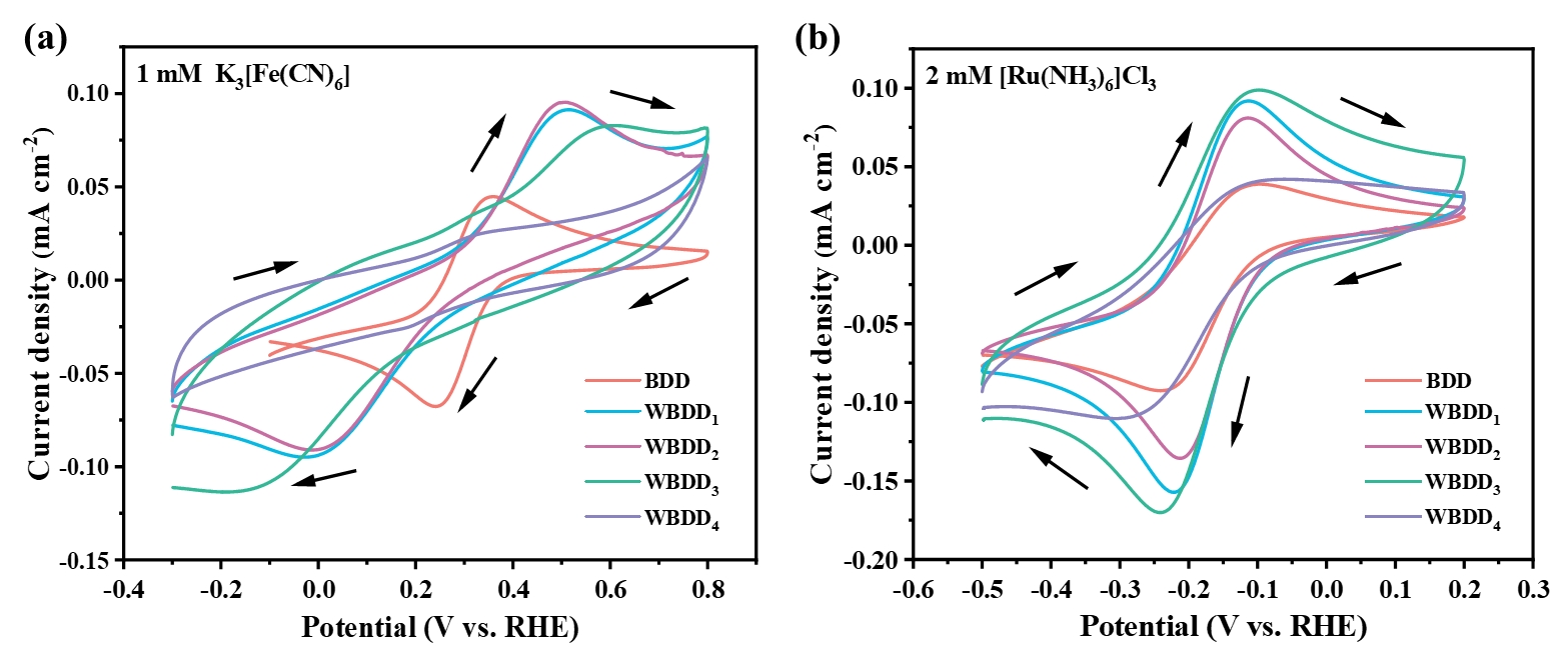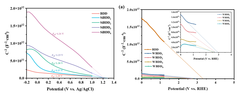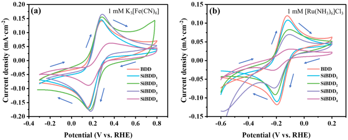 研究团队通过优化设计掺杂气路,实现了硼硅、硼钨共掺金刚石电极的可控制备,并研究了其对电极性能的影响规律。实验结果显示,硅共掺可以降低掺硼金刚石电极表面含氧官能团的含量,从而促进内球电子转移。另一方面,硅共掺也引入了额外的缺陷能级,降低了电极的载流子密度,导致外球电子转移速率的降低。此外,随着生长过程中硅浓度的提升,金刚石电极中出现碳化硅相,电极性能显著下降。而钨共掺对掺硼金刚石电极的内球电子转移产生了不利影响,同时也引入了显著的应力和额外的能级,使金刚石带隙变窄,促进了外球电子转移。该研究为新型金刚石电极的设计提供了参考。