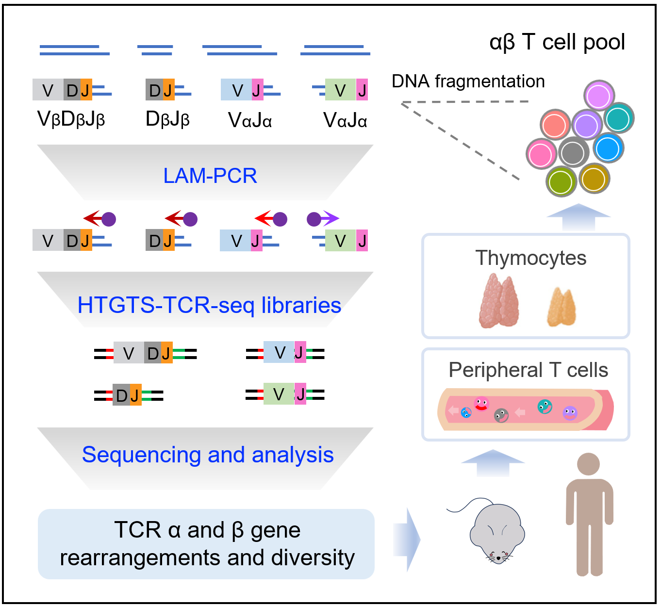10月27日,国际学术期刊Advanced Science在线发表了中国科学院分子细胞科学卓越创新中心(生物化学与细胞生物学研究所)代海强研究组联合吴薇研究组的研究成果:”HTGTS‐TCR‐Seq for Profiling of Mouse and Human T‐Cell Receptor α and β Gene Rearrangements and Diversity”。该研究基于高通量全基因组易位测序(HTGTS)技术,开发了新型DNA测序方法HTGTS-TCR-seq,旨在精准解析αβ T细胞受体(TCR)的重排过程。