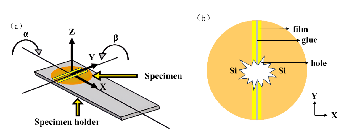 图1 薄膜TEM截面样品倾转示意图。(a):双倾杆倾转示意图;(b):薄膜TEM截面样品放置在样品杆中的方向示意图。
