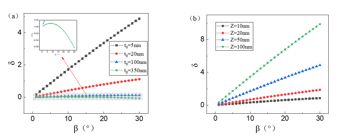 图 2 相对误差δ随倾转角度β变化的计算结果。(a):Z=50nm,不同t0的薄膜;(b):t0=5nm,不同Z的薄膜。
