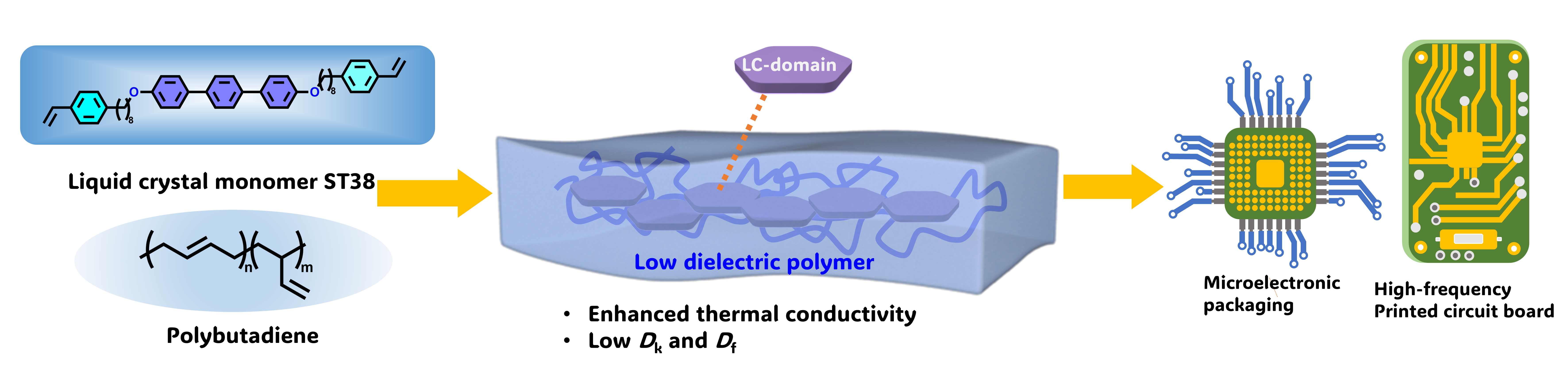 高频通信和人工智能的迅速发展推动了微电子器件向着高速传输,集成化和小型化方向发展。然而,电子器件性能的提升也同时带来了电子串扰、阻-容延迟和热量积累等问题。为了解决这些问题,需要电介质材料具有低介电常数(Dk)和低介电损耗(Df)以及高导热率,以确保信号传输的速度和质量,并同时提高散热性,延长器件的使用寿命。然而,如何实现材料兼具低介电和高导热的特性仍是一大挑战。中国科学院上海有机化学研究所房强课题组长期开展低介电常数材料的研究,近期在Advanced Materials杂志发表题为Enhancing Thermal Conductivity in Low Dielectric Polybutadiene via a Liquid Crystal Ordering Effect (https://doi.org/10.1002/adma.202517027) 的论文,利用液晶有序效应提升了聚丁二烯的导热性能,制备了导热性能良好的低介电液晶聚合物。