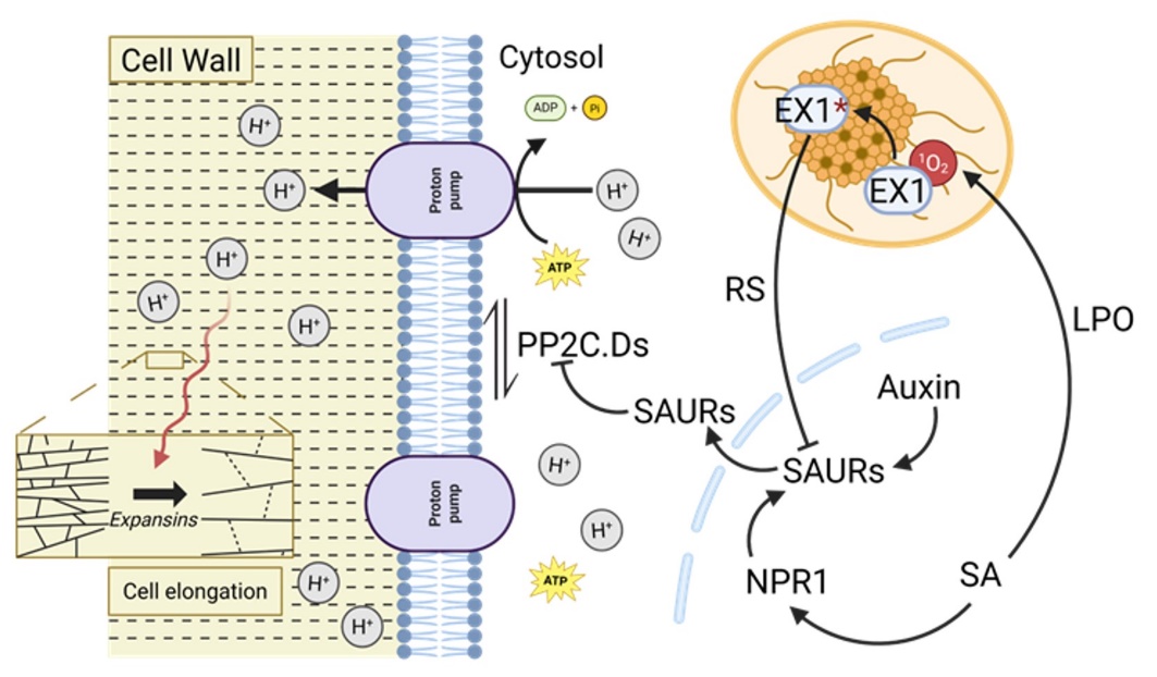 为了解决这一空白,研究小组对胁迫激素水杨酸(SA)是如何在黑暗中调节拟南芥发芽过程中的下胚轴伸长做出了研究。在这项研究中,阐述了SA抑制的下胚轴生长呈剂量依赖性,并且npr1突变体对于SA处理更为敏感,强调了NPR1在黑暗中SA积累下维持生长的作用。与此同时,该研究发现了核定位的NPR1通过维持生长素应答基因(比如SAURs和EXPs)的表达以此消减SA诱导的生长抑制。过表达SAUR19或SAUR63的确完全恢复了npr1在黑暗中的表型。再者,此研究阐述了SA在黑暗中触发脂质过氧化(lipid peroxidation),产生1O2并激活EX1介导的逆向信号(从黄化质体到细胞核),从而抑制生长素相关基因,限制下胚轴伸长。
