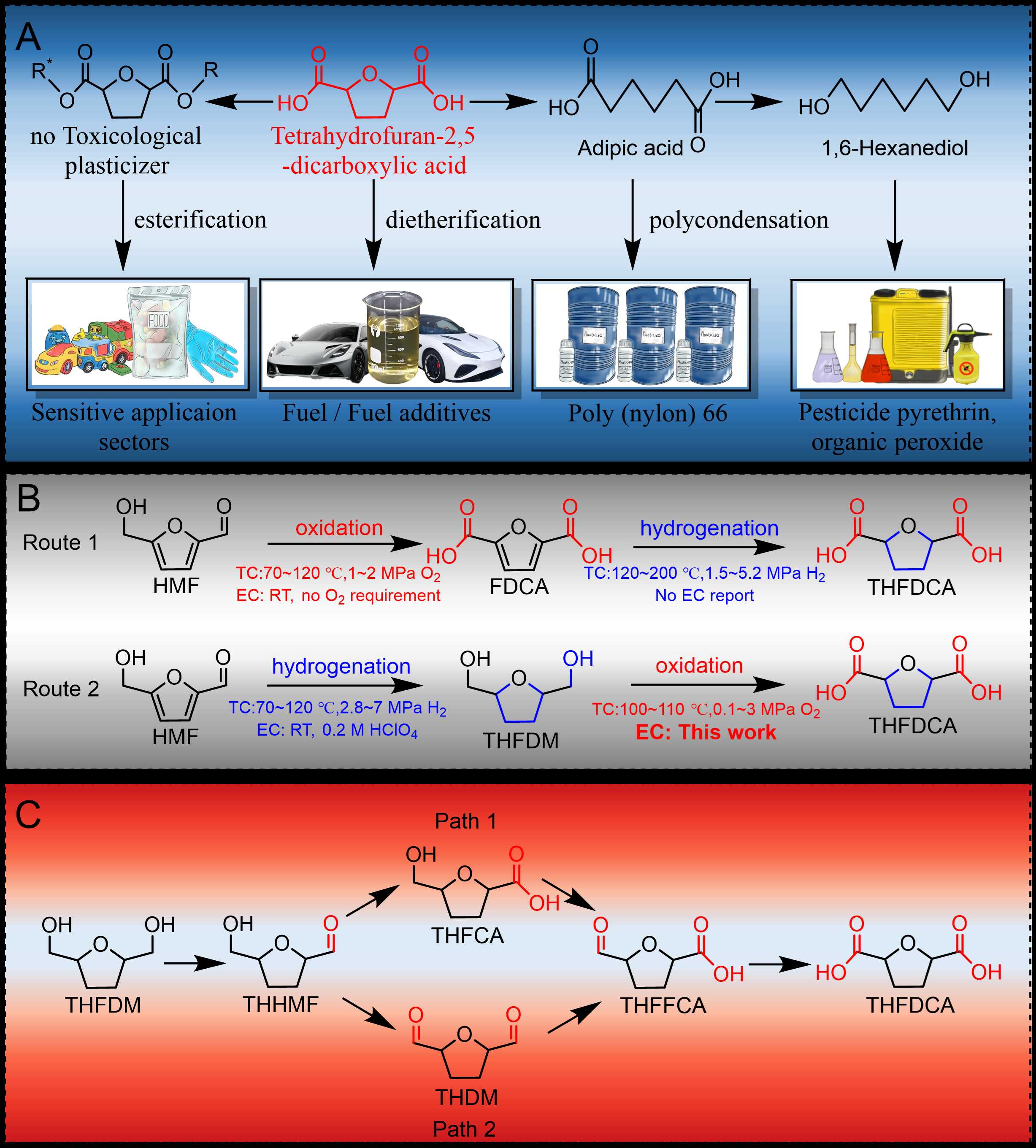生物基呋喃聚合物因其五元环结构比六元苯环结构更小,通常比石油基同类聚合物具有更好的气体阻隔性能和机械特性。然而,呋喃环的刚性平面共轭结构限制了下游衍生品的柔韧性和可加工性,从而限制了其应用场景。以2,5-呋喃二酸(FDCA)为例,对其呋喃环进行加氢,生成四氢呋喃二甲酸(THFDCA),可以显著降低呋喃环的结构刚性,并产生两个手性碳原子,在特种高分子、功能膜、涂料、手性药物等领域具有潜在重要应用。然而,FDCA加氢合成THFDCA难度大(图1b,route1),依赖贵金属催化剂,同时反应温度和压力要求高,亟需探索更加温和高效的合成方法。
