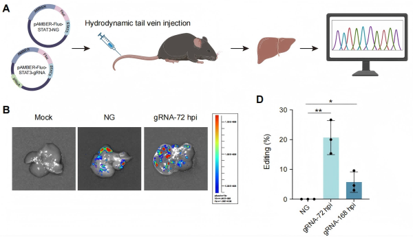 图:AMBER编辑器在小鼠肝脏中的表达及编辑功能验证。(A) AMBER 体内递送及编辑验证示意图;(B)通过与 AMBER 融合表达的 Fluc 信号验证编辑系统在肝组织中的成功递送与表达;(C) 注射后 72 h 与 168 h 时肝组织中靶位点的编辑效率。