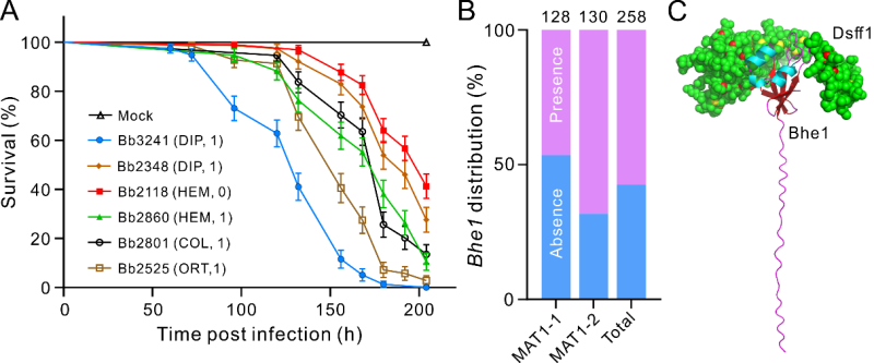 在前期白僵菌种群遗传研究的基础上(ISME J,2020),他们针对近300个球孢白僵菌菌株按原始分离寄主、以昆虫目为单元进行分组,基因组关联分析表明:初始分离自双翅昆虫的菌株基因组存在两个异常位点(outlier)。进一步针对不同位点编码基因进行基因缺失及生物测定,获得显著影响白僵菌感染蝇类昆虫的潜在效应子基因Bhe1,该基因不仅在不同菌株中存在有无的二元分布特征,编码蛋白也存在长度差异。Bhe1基因缺失突变株感染双翅目的蚊虫及其他目昆虫的毒力不受影响。