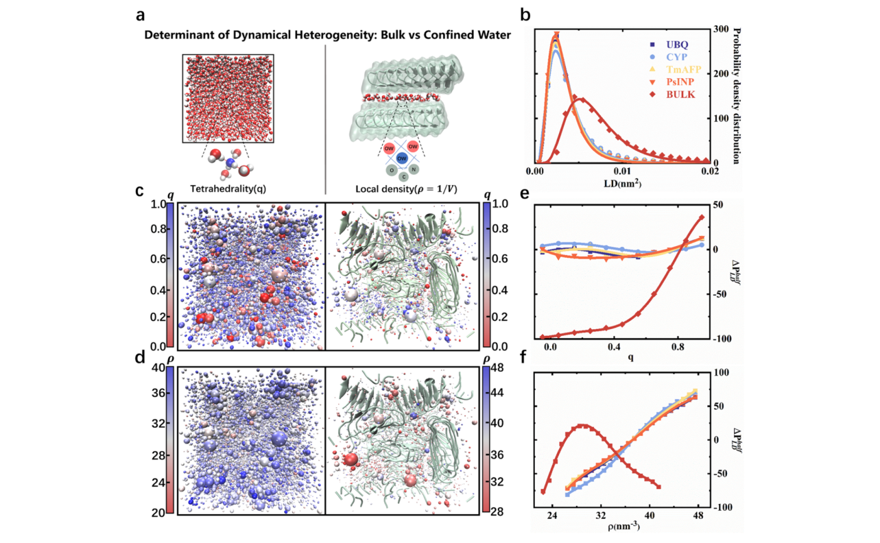 水在纳米限域或界面环境下表现出与体相完全不同的热力学与动力学性质。例如,极端限域的水可以在远低于0℃时仍保持液态,或者结晶成异于常规冰的多晶型态。在生物体系中,细胞内大量拥挤的生物大分子将水局限在纳米级空间,由此衍生的特殊水环境会显著影响蛋白折叠、酶促反应速率等过程。尤其在深度过冷条件下,限域水的复杂动力学特征与相变行为息息相关。然而,人们对于限域过冷水的“动力学非均一性”知之甚少。这一非均一性指的是液体中存在快慢不同的分子运动区域,它在体相过冷水中尤为明显:移动较慢的区域往往出现局部冰样的结构排布,成为日后冰核的“温床”。正是这种较慢动力学与增强结构有序度的耦合,使得动力学非均一性被认为促进了体积水中的冰晶成核。然而,当水被限制在纳米尺度(例如蛋白质表面)时,这种动力学-结构间的关联是否会被显著改变,目前尚不清楚。澄清这一问题对于理解限域环境下冰核形成的机制至关重要。