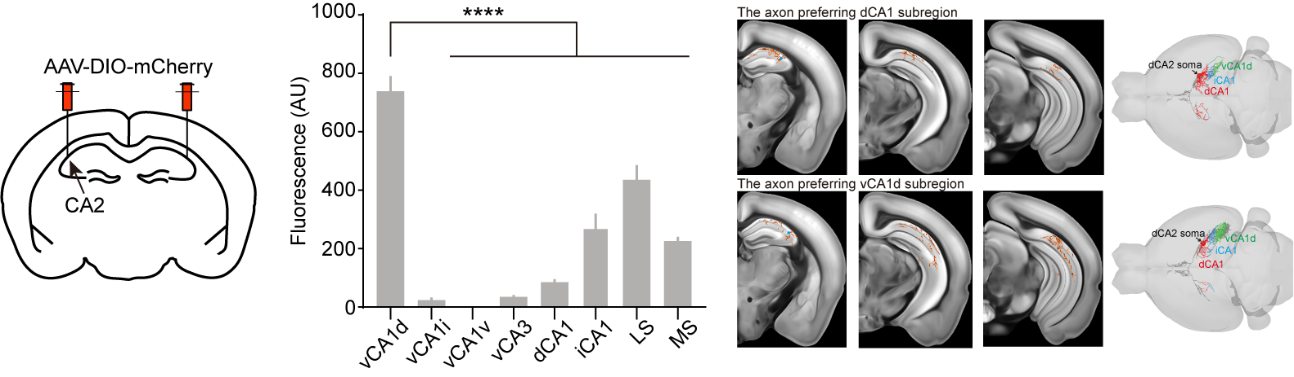研究团队结合单细胞全脑投射谱分析和环路示踪实验,发现dCA2神经元的整体输出以长轴环路为主,到vCA1背部区域(vCA1d)的投射强度最高(图1)。单个dCA2神经元对dCA1和vCA1d的投射强度存在明显的差异化(图1)。