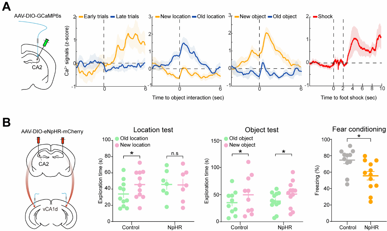 图2:dCA2在空间和场景依赖性记忆中的作用。(A) dCA2神经元对物体接触和足部电击呈现特异性钙信号反应。(B) 阻断dCA2-vCA1d投射环路会损害物体位置记忆和场景恐惧记忆。