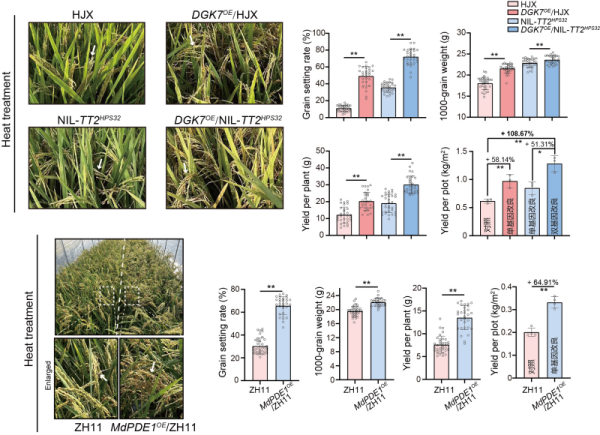 定向遗传改良在模拟高温的田间试验中取得成效:DGK7或MdPDE1的单基因改良的水稻株系比对照株系增产50%至60%;TT2协同DGK7的双基因改良株系比对照株系产量提升约1倍、米质改良明显,且正常条件下对产量性状无负效应。这表明,基于该通路的精准育种设计可实现耐热表型的梯度化调控,为水稻、小麦、玉米等主粮作物应对不同强度的高温胁迫提供了灵活的定制化解决方案,从而为育种家培育“高产高抗”作物新品种提供了重要的理论依据和基因资源。