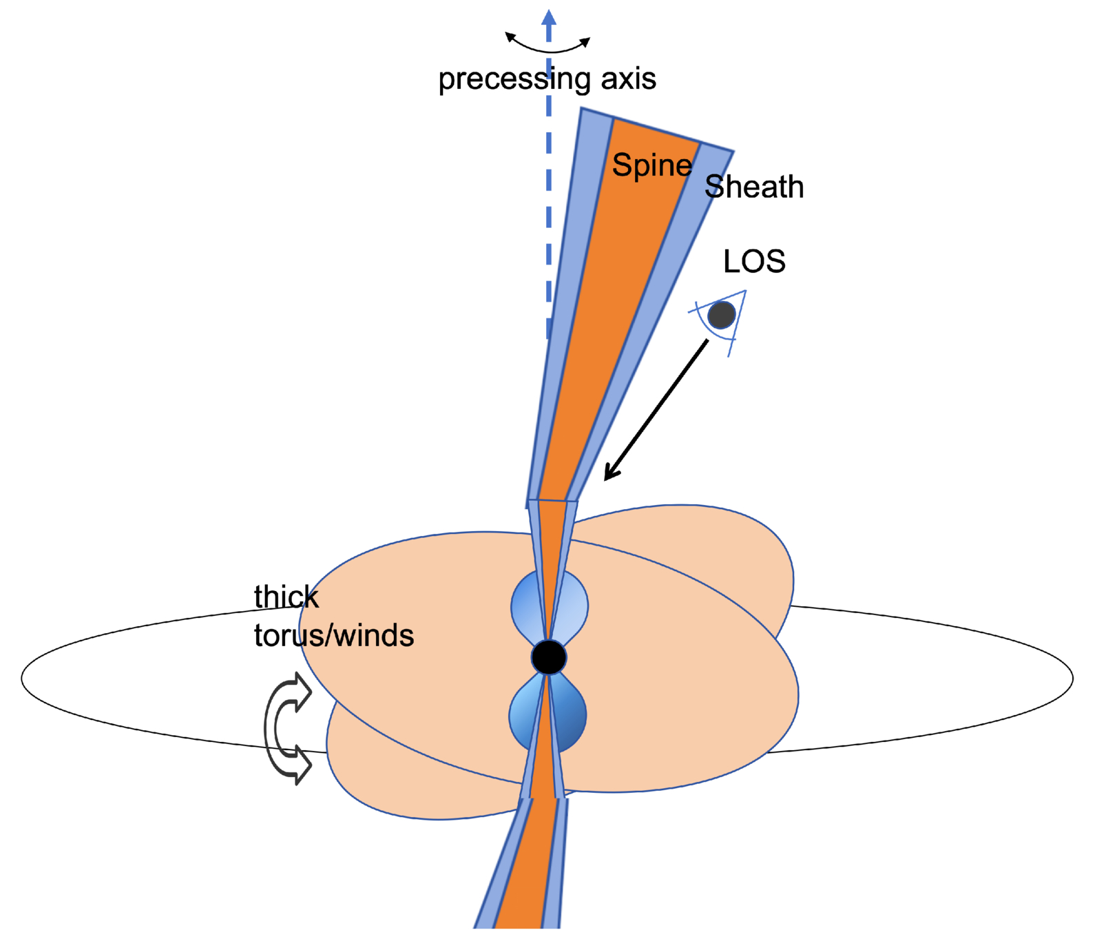 GRB 250702B提出的进动、磁场主导、结构化喷流模型的几何结构