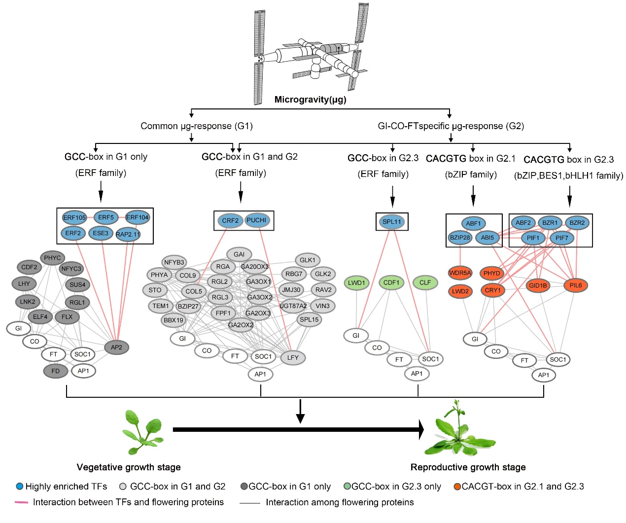 近日,中国科学院分子植物科学卓越创新中心科研团队报道了我国空间站空间微重力作用于植物开花的实验结果。研究发现,植物在转录水平上对微重力的响应包括GI-CO-FT模块特异性和非特异性两条途径。GI-GO-FT特异性响应微重力,经由ERF、bZIP、bHLH和BES1转录因子共同调控的GCC-和CACGTG-元件,调控开花途径关键基因的表达,进而改变GI-GO-FT模块中关键基因的表达,导致植物对微重力的响应发生改变。