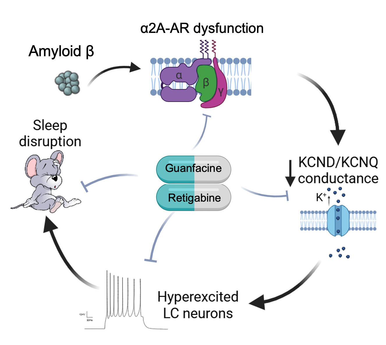 研究团队通过5xFAD转基因阿尔茨海默病小鼠模型,结合睡眠监测、全细胞膜片钳、药理学调控等多种技术手段发现,2月龄阶段的5xFAD小鼠已出现暗周期特异性觉醒过度及脑状态转换能力下降的病理表型。在机制层面,研究团队观察到蓝斑神经元存在暗周期时相特异性自发放电频率升高的现象,其底层机制表现为:Aβ寡聚体干扰了维持蓝斑神经元正常活动水平的α2A型去甲肾上腺素受体功能,使其对两种具有神经元活性“刹车”效应的电压门控钾离子通道4(Kv4)与电压门控钾离子通道7(Kv7)的调节功能失灵,进而造成蓝斑神经元兴奋性在暗周期出现异常升高。
