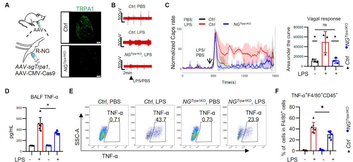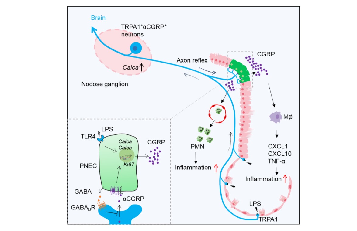 该研究揭示了迷走神经NG的TRPA1+神经元末梢支配PNECs、识别肺内LPS激活NG神经元的CGRP应答,并促进PNECs合成CGRP,进而放大肺部炎症应答的神经免疫调控机制。