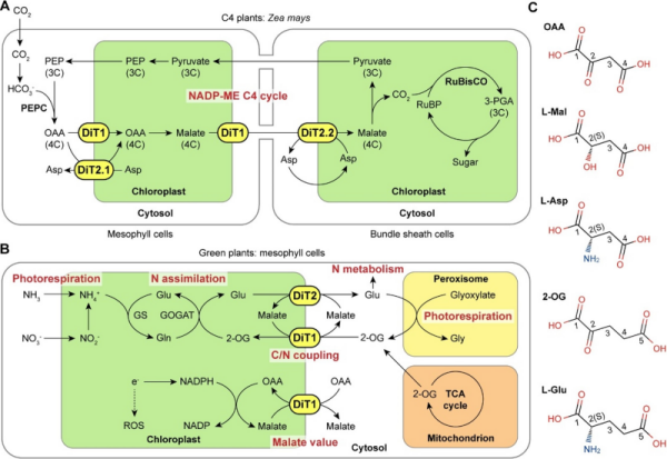 近日,中国科学院分子植物科学卓越创新中心团队,解析了C4植物光合碳浓缩系统叶绿体膜四碳二羧酸转运蛋白DiT1/2的高分辨率三维结构,阐释了其底物选择性识别和转运的分子机制与进化历程,为理解C4光合作用提供了分子见解。