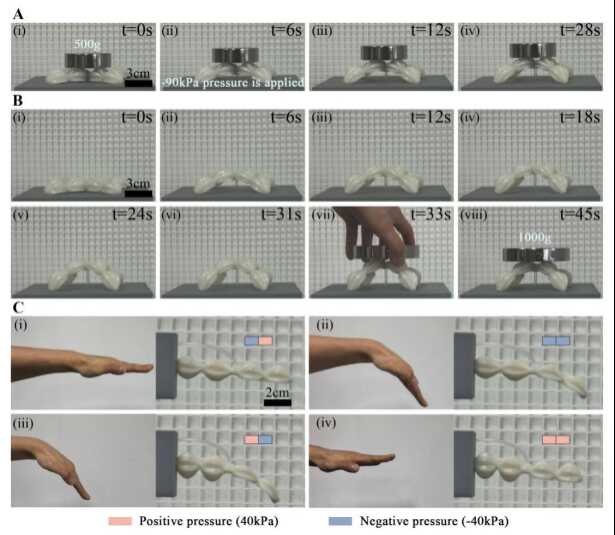团队还提出了一种模块化设计方法,通过与以上致动器相结合,设计了多种不同形式的软体结构,包括S形,Ω形,四爪形,椭球形和马鞍形面结构(图2),仿生手臂结构以及承重桥结构(图3),展示出了极大的结构设计广度。