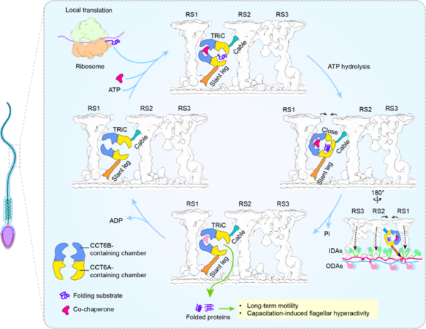 研究显示,靶向抑制TRiC的ATP酶活性,可抑制小鼠精子鞭毛摆动,但不影响缺乏RRB结构的斑马鱼精子运动,证实TRiC对维持哺乳动物精子运动具有重要作用。基于此,研究发现,在持续机械运动中受损的轴丝组分可通过鞭毛内原位合成、邻近TRiC捕获并折叠的方式及时替换,从而维持鞭毛长期稳定摆动。
