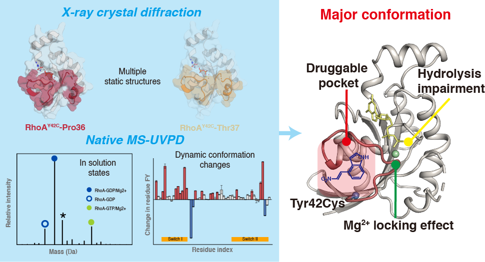3月16日,中国科学院上海药物研究所联合大连化学物理研究所,创新性地整合了非变性质谱、紫外激光解离技术及X射线晶体学,揭示了弥漫性胃癌相关靶蛋白RhoA的Y42C突变体“隐藏”动态构象,并发现了针对该“隐藏”构象的共价抑制剂。这一多维技术路线充分利用了紫外激光解离质谱在靶蛋白动态构象和瞬态互作测量方面的高选择性与高灵敏度优势,为靶向高动态“不可成药”蛋白建立了新的研究范式。