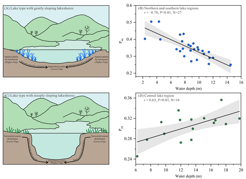 针对上述问题,中国科学院南京地理与湖泊研究所研究团队提出了湖泊水下地形调控正构烷烃Paq指标与水位关系的假说。云南洱海水下地形具有北部、南部湖盆较平缓与中部湖盆较陡峭的地形特征,研究团队将其选为研究对象,并通过系统调查该湖泊陆生植被与水生植被、湖泊沉积物中正构烷烃组成及空间分布特征发现,湖泊表层沉积物中长链与中链正构烷烃分别来自河流搬运输入和水生植物原地埋藏,且全湖湖泊表层沉积物样品的Paq指标与湖泊水位相关性较弱,这表明水下地形在变化情况下,Paq指标与水位的关系较为复杂。研究团队进一步将研究区域划分为北部、南部(缓坡型)及中部(陡坡型),发现Paq指标与湖泊水位的相关性显著提升,但呈现两种相反的相关性结果,上述结果证实了湖泊水下地形对正构烷烃指标在古水位解译中具有调控作用的研究假说。
