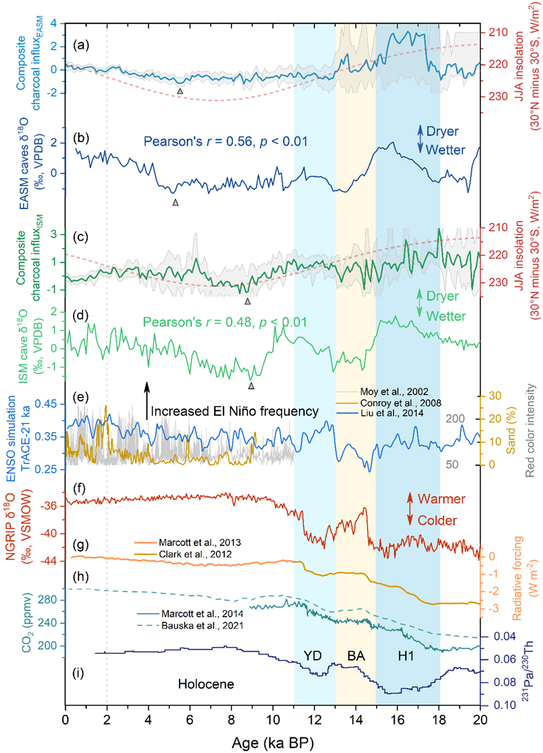 图2. 过去两万年来亚洲季风区古火活动与亚轨道时间尺度驱动因子的对比