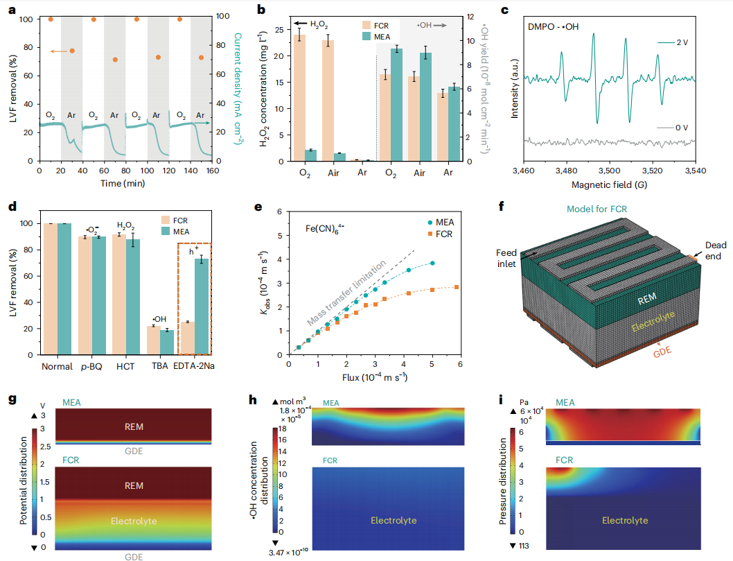 针对这一问题,研究团队创新性地将气体扩散电极与电化学活性膜电极相结合,组装了膜电极组件(MEA)水处理系统,实现了阴极氧还原反应和阳极氧化反应的耦合增效。中国科学院上海高等研究院的研究团队在本工作中,特别是在理论计算与模拟方面提供了关键支撑。通过多物理场模拟,清晰揭示了MEA系统中电位分布、活性物质浓度场(如HO₂⁻和·OH)及流体压力场的变化规律,从理论上阐明了该装置相对于传统流动池反应器(FCR)在传质效率、反应动力学和电流密度方面的优越性,为器件设计与性能优化提供了重要理论依据。